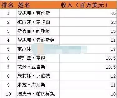 从2013年至今,冰冰连续多年占据褔布斯中国名人榜首位,在今年全球十大收入最高女星榜中,以约1.1亿人民币位居第五,为榜中唯一的华人女星!