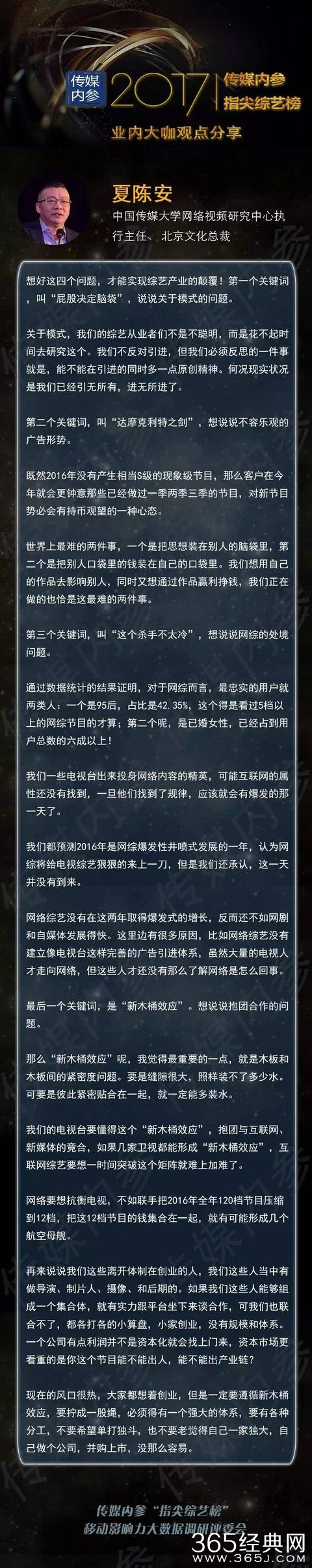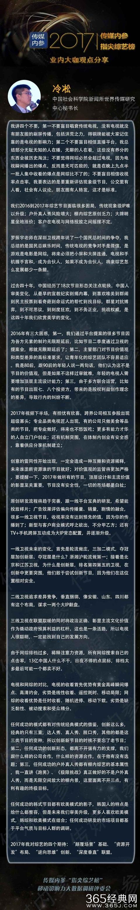 传媒内参2017“指尖上的综艺”移动影响力高峰论坛上,中国传媒大学网络视频研究中心执行主任、北京文化总裁夏陈安,中国社会科学院新闻所世界传媒研究中心秘书长冷凇的演讲内容在听众中引起了热烈的反响和讨论,今天特别整理二位专家最全面的观点与读者分享!