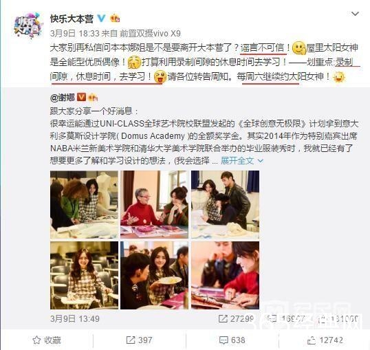 随即,谢娜也在微博上宣布自己要去意大利留学的消息,并且还是获得了意大利多莫斯设计学院的全额奖学金!小编虽然不了解这个学校,但是一听到全额奖学金就莫名觉得很厉害呀!