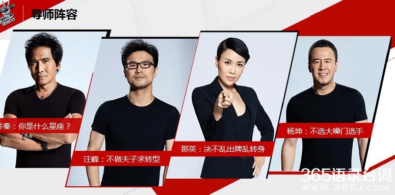 《中国好声音第三季》2014年7月18日回归浙江卫视,由那英、杨坤、汪峰、齐秦四人组成“那样忘情”导师群更是异常活泼,除去学员的精彩表现外,导师之间争学员时更是唇枪舌剑互爆金句,看点十足,365语录台词网特意为你收集整理了中国好声音第三季中的经典台词语录,希望你能喜欢!