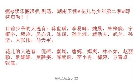 湖南卫视《花儿与少年》第一季您看过了吗?花儿与少年的经典台词旁白语录是不是还没攒够呢?好消息来啦!《花儿与少年》第二季即将启动,花儿与少年人选名单也被爆出(具体名单见图),下面就是365语录台词网的小编为你编辑整理的花儿与少年第二季经典台词的相关内容,我们会为您及时编辑整理经典台词旁白语录!
