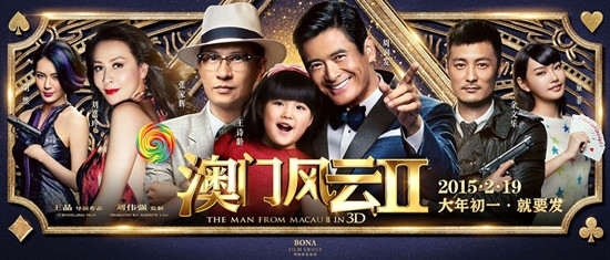合家欢贺岁喜剧《澳门风云2》由博纳影业集团出品,王晶导演,刘伟强监制,由周润发、张家辉 、刘嘉玲、余文乐、王诗龄、 胡然、吴樾、金巧巧、黄德斌、袁泉、孟瑶等联袂主演。《澳门风云2》延续了前作《澳门风云》的故事,讲述外号“赢尽天下无敌手”的石一坚退隐江湖之后的故事。该片已于2015年2月19日(农历大年初一)正式全国上映。
