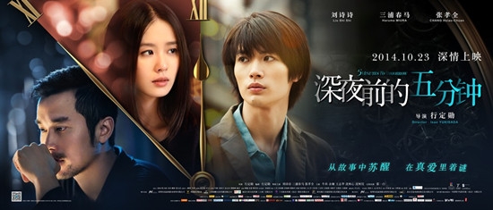 《深夜前的五分钟》是根据日本小说作家本多孝好的小说《午夜的五分前》改编的悬疑推理爱情电影。电影由刘诗诗、三浦春马、张孝全等领衔主演,讲述了若蓝、如玫两个孪生姐妹与阿良、天伦两个男人之间扑朔迷离的爱情故事。 电影于2014年10月2日釜山国际电影节全球首映,2014年10月23日中国大陆上映,2014年12月27日在日本上映。