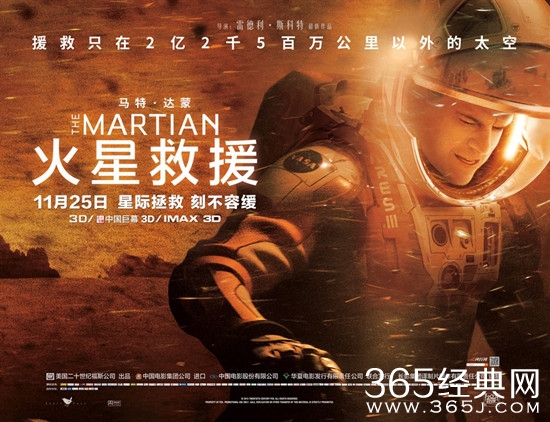 《火星救援》是由美国二十世纪福斯电影公司出品的科幻冒险片,由雷德利·斯科特执导,马特·达蒙、杰西卡·查斯坦、杰夫·丹尼尔斯、切瓦特·埃加福特联袂主演。根据安迪·威尔的同名小说改编,讲述了由于一场沙尘暴,马克与他的团队失联,孤身一人置身于火星面临着飞船损毁,想方设法回地球的故事。该片于2015年10月2日在美国上映,2015年11月25日以IMAX3D格式在中国大陆上映。