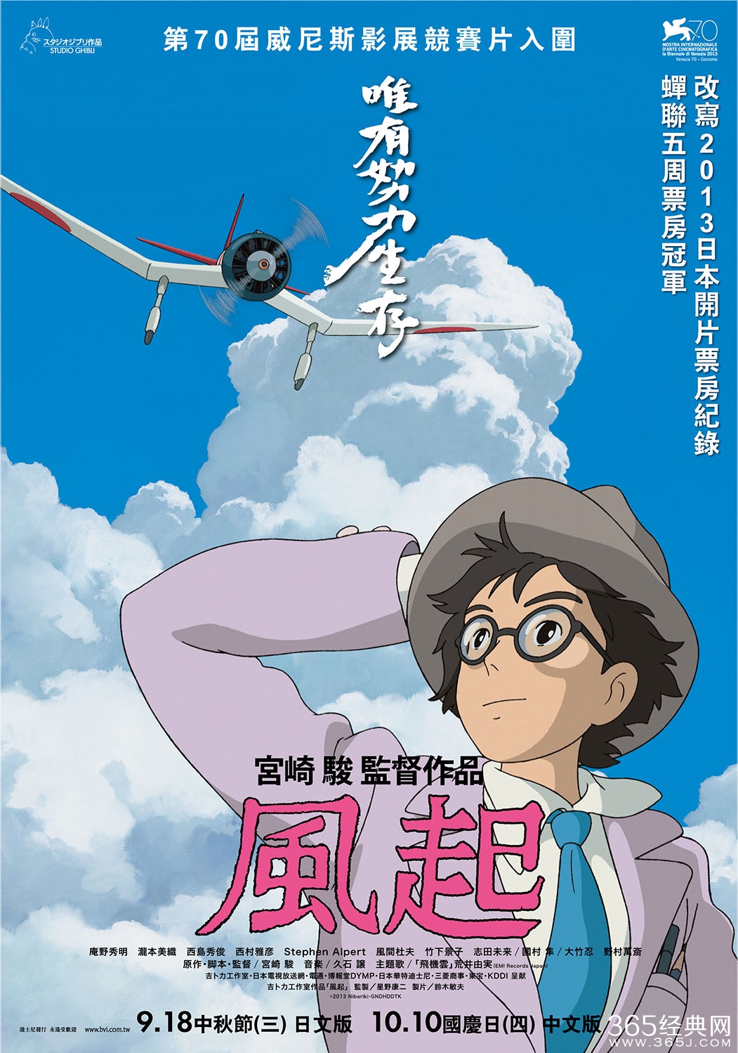 《起风了》(英语:THE WIND RISES)是导演兼脚本的宫崎骏以同名漫画所改编的动画电影。讲述的是日本零式战斗机的开发者堀越二郎年轻时的故事。宫崎的作品,大多洋溢着像出现乘着扫帚在天空飞、鱼子从海边而来这样的幻想元素。但这次在影片中,没有不可思议的魔法,也不会出现怪物,堀越二郎是第二次世界大战中设计零战的实际存在的人物。影片中,宫崎骏在表现对飞机的热爱之余,还打造了二郎和卡普罗尼相会时的动荡年代,展现了日本大正、昭和时代的田园风光、市井乡情、噩梦般关东大地震等。