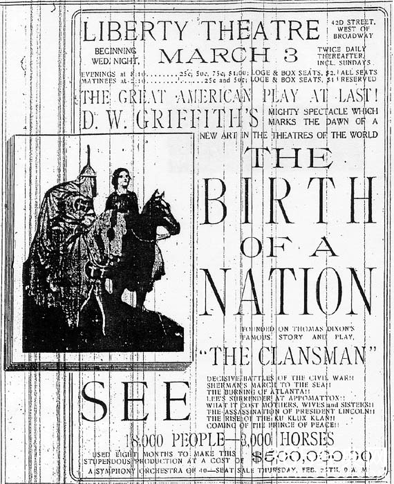 《一个国家的诞生》是由大卫·格里菲斯执导,丽莲·吉许、亨利·B·沃斯奥、梅·马素等主演的历史爱情电影。影片于1915年3月3日在美国上映。本片以美国南方和北方的两个家族在内战前后的命运发展为主线,以南北战争及其前后的政治变迁为副线,展示了当时波澜壮阔的美国社会生活,涉及战争、爱情、政治、历史、种族等诸多元素。影片从南方的角度描写美国内战,提倡白人优越主义,把三K党美化成正面形象,因此内容颇具争议性。但专家一致公认,它是电影发展史上的一座里程碑,是第一部史诗片。闪回、特写镜头、战争场面的布置等大量电影叙述的基本语汇由此诞生,使得电影成为一种更为成熟的艺术。