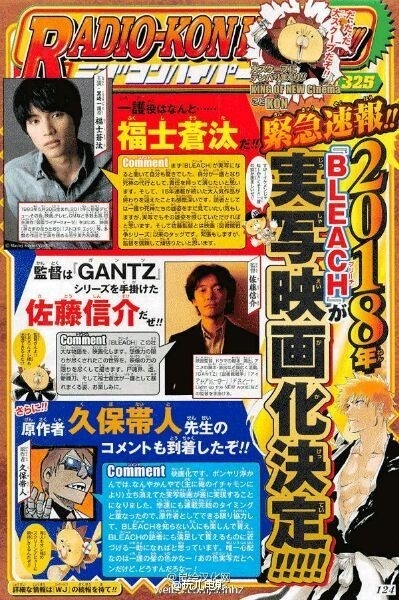 据知名动漫网站animenewsnetwork爆料称,日本经典漫画《死神》连载15周年将于本周完结。除此之外,《死神》将开拍真人电影,作品预计于2018年上映,福士苍汰或将担任影片主演,饰演男主角黑崎一护。