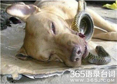 这只忠犬叫Chief,为了保护主人,勇敢和闯入屋内的眼镜蛇对抗,虽然最后成功将蛇杀死,但是这只狗也因为被咬伤而一命呜呼,在生命结束的前几秒钟,还不忘看着主人摇动着尾巴。可能他并不知道自己要死了,他只知道只要活着,他就是为了取悦主人而存在。