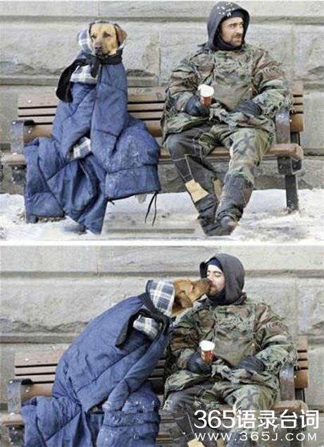 加拿大流浪汉,摄氏零下15度,用满是补丁的衣服把自己包得紧紧的,然后把他唯一的财产、或许也是最重要的财产睡袋给了他的狗狗。