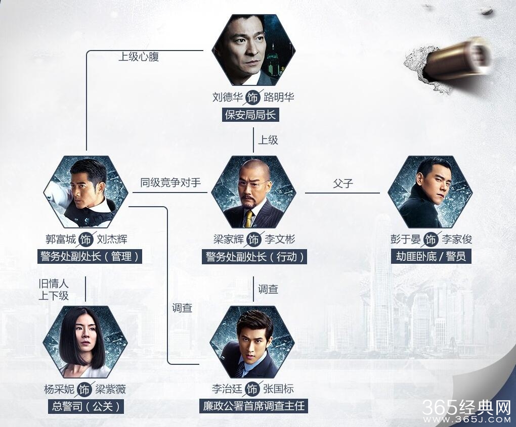 刘德华演是是保安局局长路明华,刘杰辉(郭富城)警务处副处长主要负责管理,路明华是刘杰辉上级也是他的心腹。而梁紫薇(杨采妮饰演)是刘杰辉的下级也是老情人,现在是总警司的公关。而和刘杰辉同级,同为警务处副处长的李文彬(梁家辉饰演),他们是竞争对手,都对局长这个位置虎视眈眈。李文彬还有个儿子叫李家俊(由彭于晏饰演),他是警队中的内鬼。而李文彬手下还有一个得力助手,名叫张国标(由李治廷饰演),他一直在调查刘杰辉。
