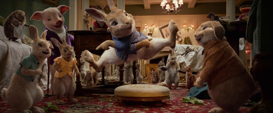 预告中,比得兔大胆挑衅狐狸,淡定表示:“你之前是不是想吃我,让我看看你的牙齿。”露出锋利牙齿的狐狸显然对比得兔没有威慑力,一只欢脱勇敢的兔子形象跃然于屏幕。趁着老麦奎格的房子暂时没有新主人,比得兔率领蜜獾、刺猬、小猪、麋鹿等动物朋友大摇大摆“登堂入室”开派对,这也给回家后的小麦奎格一个大大的“惊喜”:屋中一片凌乱,始作俑者却不知去向,正当麦奎格坐在沙发上发懵的时候,小猪他身旁的被单下缓缓站起,人猪对叫的场面爆笑上演,一人一猪现场飚高音,鬼畜画风“笑”果奇佳,网友笑称“这段也就看了20多遍,真·笑出猪叫。”随着麦奎格和小猪的“二重唱”,隐藏在家中各处的小动物们纷纷现身,混乱的场面把麦奎格吓到怀疑人生,人兔大战的导火索由此埋下。
