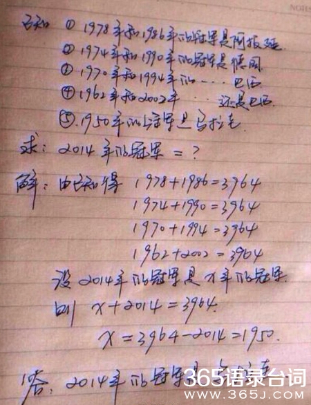你造吗,在学霸眼里,世界杯冠军也是可以算出来的~~今年巴西世界杯的冠军将是曾在1950年得过冠军的乌拉圭,这种冒死泄露天机的事情你也敢做,小编今天姑且就信你一次,押注之前先把这篇每日轻松一刻(6月26日午间2014)推荐给大家,成就住别墅,败就天台见!!!