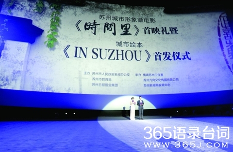 时间都去哪儿啦?时间停留在苏州。7月8日,由苏州市政府新闻办公室和苏州日报报业集团联合摄制的城市形象微电影《时间里》举行盛大首映礼。在延续国内首部官方城市形象微电影《苏州情书》风格的同时,本片进一步挖掘城市内涵,突出苏州作为创业之城、宜居之城、爱心之城的青春活力和动人魅力。接下来就让365语录台词网具体为您介绍一下。