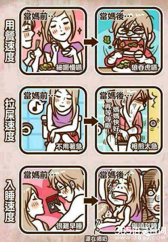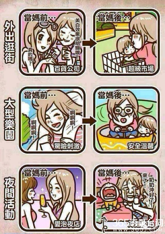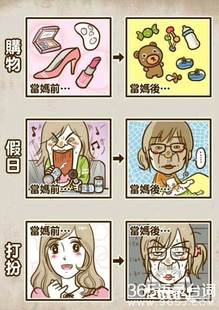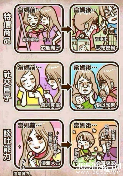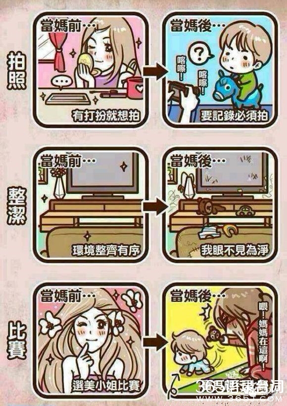 当妈的不容易哇,想想现在的80后,更甚至是90后的妈妈们,想想当初,算了别提当初了,说多了都是泪啊,有孩子前潇洒恣意,有孩子后沦为生活的奴隶,加入到孩奴、房奴的庞大组织中,回想过去的单身生活,回味当初的两人世界,满满的都是泪哇!80、90后的妈妈们,下面跟随365语录台词网看看当妈前和当妈后的对比图吧。