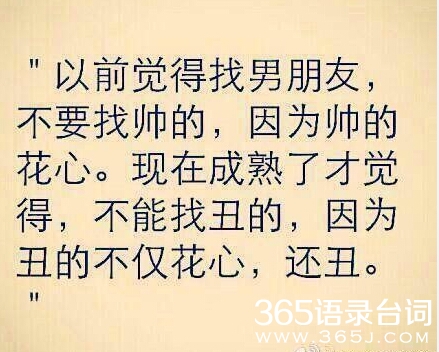 以前觉得找老公不能找帅的,因为帅的花心;现在成熟了才觉得不能找丑的,因为丑的不仅花心还丑!说的好像不想找帅的,就有一大波帅哥哭着喊着缠着你要似的,想找帅的,就有一大堆排着队等着你来挑似的!!!
