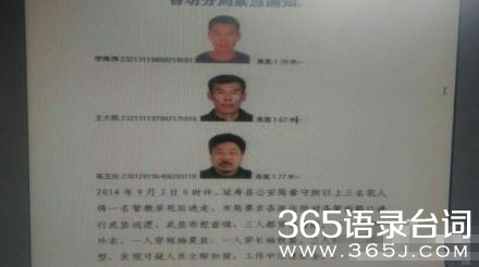 延寿县公安局看守所三名犯人将一名管教杀死后逃走,哈尔滨市公安局要求各派出所对各管内路口进行武装巡逻,武装布控查缉,三人都穿着警服,一人穿警服外衣,一人穿短袖夏装,一人穿长袖秋装,三人均为正常发型,发现可疑人员立即扣留,工作中注意安全。下面就是365语录台词网的小编为你编辑整理的3犯人杀管教越狱的相关内容,就让我们一起来看一下吧!