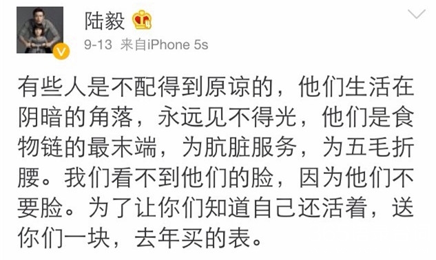 村长李锐也微博力挺陆毅:“在别人父亲微博里骂孩子的人,你们听着:陆毅是个宽厚开朗的人,如果他都愤怒了,说明你们太过分了。我不知你们骂人的初衷,如果是缺少家庭温暖的宣泄,我希望能帮到你。如果是收钱为别人办事,我鄙视你。如果就是耍流氓,我们见面谈谈,地点你定!混蛋!”