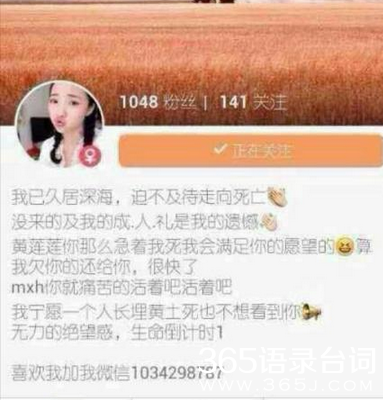 其实女孩的死亡是有计划的,从她的微信可以发现,这位少女早就已经在做生命倒计时了,而且还有某个女的也希望她死,女孩子可能处于赌气就选择结束自己的生命。这位17岁的少女真的是太涉世未深,太幼稚了!