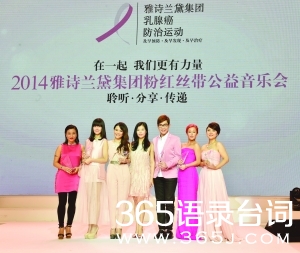 雅诗兰黛集团发布了全球首支粉红丝带中文主题曲《飞翔的丝带》,“我们抬头迎着天空呼喊,头上丝带随风漫舞飞翔;让指缝的阳光,温暖每吋不安;不够幸运,亲吻天使的翅膀;至少我们有彼此肩膀,一起依靠仰望”,动情的词曲深深打动了演唱者周蕙,她在录音棚录制这首歌时,不禁潸然泪下,这首歌让她想起了身边一些患病却依然执着坚持着的朋友。