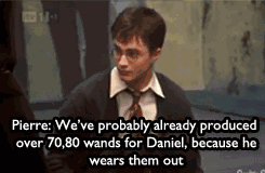 丹尼尔小时候有点调皮,剧组最起码做了七八十根哈利的魔杖,因为丹尼尔没事就喜欢拨弄魔杖,这样就很容易磨损。