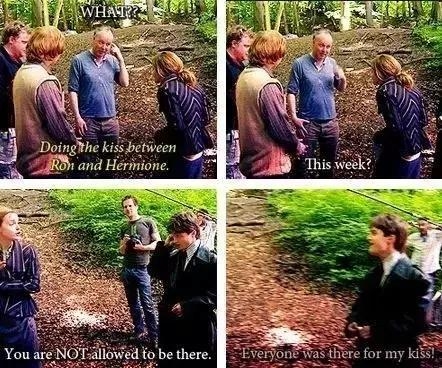不过艾玛和鲁伯特两个人拍这场戏还是超——尴尬,NG了好多次。他俩都觉得从小一起长大的像兄弟姐妹一样的人,拍吻戏感觉很奇怪诶。