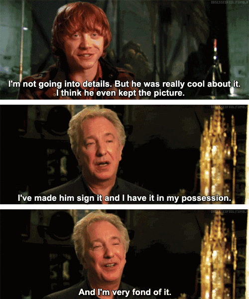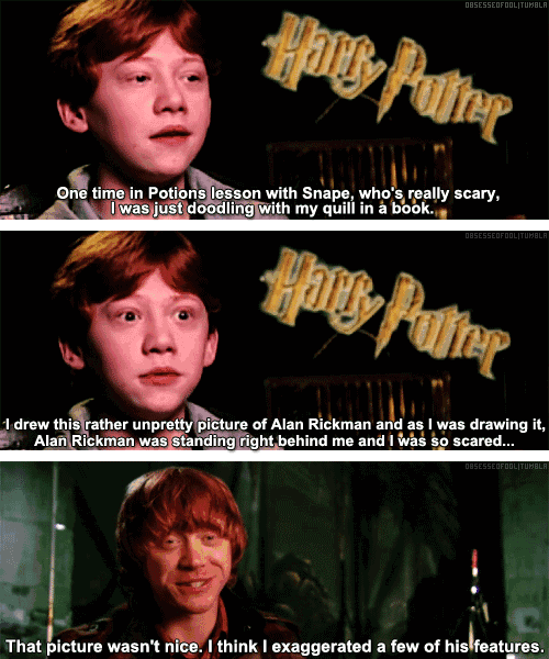 有一次和斯内普教授对戏,年轻调皮的鲁伯特在纸上画了张艾伦巨丑的画像,完全不知道教授就站在他背后。