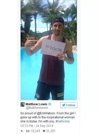 扮演纳威的当年那个小胖子马修,长成了型男。他像是整个剧组的大哥哥,会去看丹尼尔的表演,会在网上声援艾玛的#HeForShe#活动。