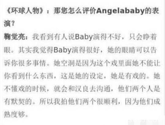 对于baby的眼神空洞及演技问题,导演站出来力挺baby称其演技很好,眼睛可以告诉你很多事情,她空洞是因为这个戏里面她不能让你看到什么东西,这是她的设定。