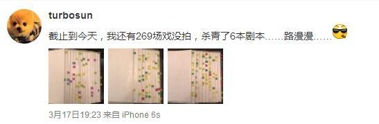 近日,孙俪在微博上晒出几张剧本的照片,并感叹到:“截止到今天,我还有269场戏没拍,杀青了6本剧本……路漫漫……”