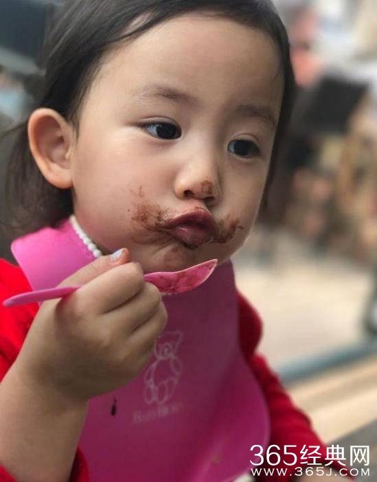 该图中,黄磊小女儿正手拿粉色小勺贴近嘴边,微微鼓起的脸颊与鼻头都沾满巧克力色痕迹,样子呆萌,十分可爱。