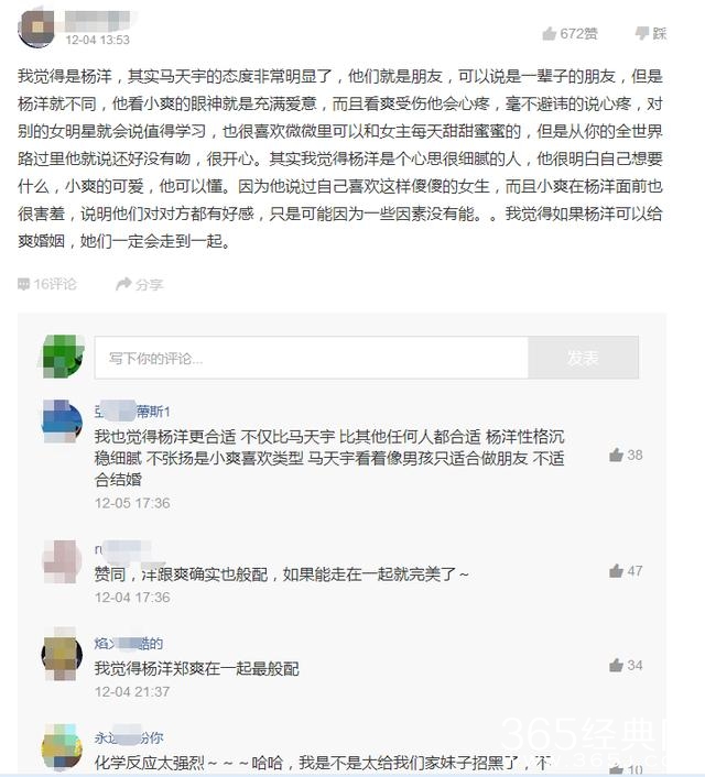 大多数人并没有看好马天宇和郑爽会走在一起,因为网友们看的更多的是马天宇和郑爽之间无坚不摧的友情,看好杨洋的人并不在少数。