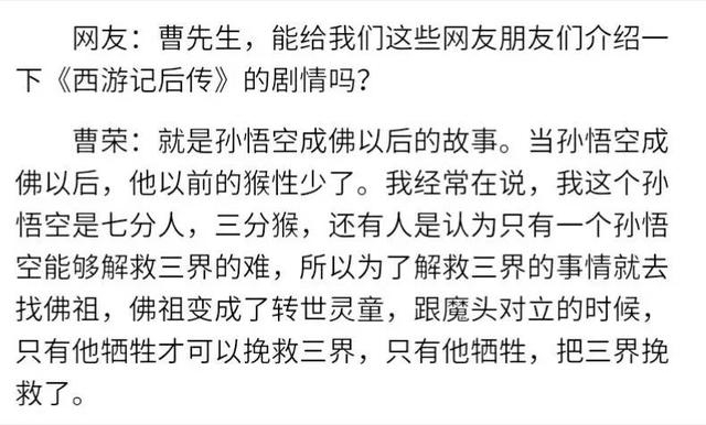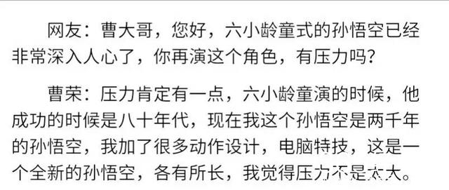 而曹荣也对表示参演孙悟空这一角色还是稍有压力的,但也解释自己的孙悟空是一个全新的孙悟空,七分人,三分猴,并十分有自信心的为自己的孙悟空打了八十分的成绩。