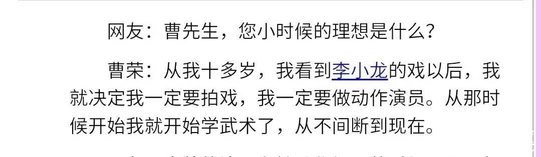 早前,在一次采访中,曹荣曾透露,自己在看过李小龙的电影后,也一心想要成为一名演员。在做武术指导的这些年,曹荣也没有放弃自己的梦想。也曾参与到自己所导演的作品中去,但影响力一直不大。相比曹荣担任武术指导取得的成就而言,他的演员生涯更加坎坷。