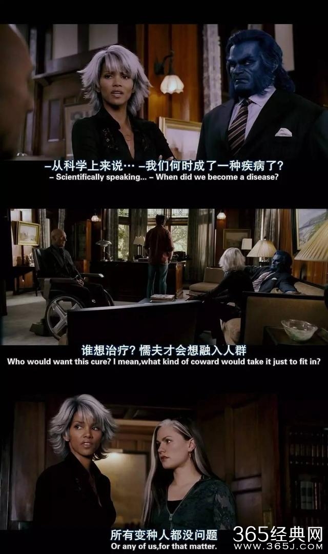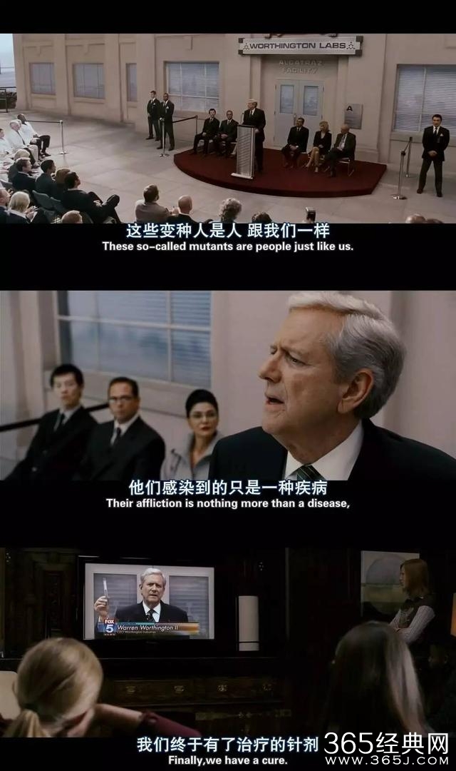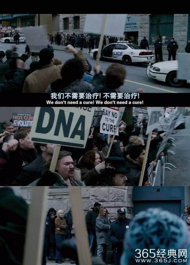 片中出现的抗议【变种人治疗说】的集会游行,那些在群众口水和媒体镜头下,低头悻悻接受药剂的变种人长队。这些场景画面都具有极强的现实倒影,在有关西方社会的新闻报道中时常可见。