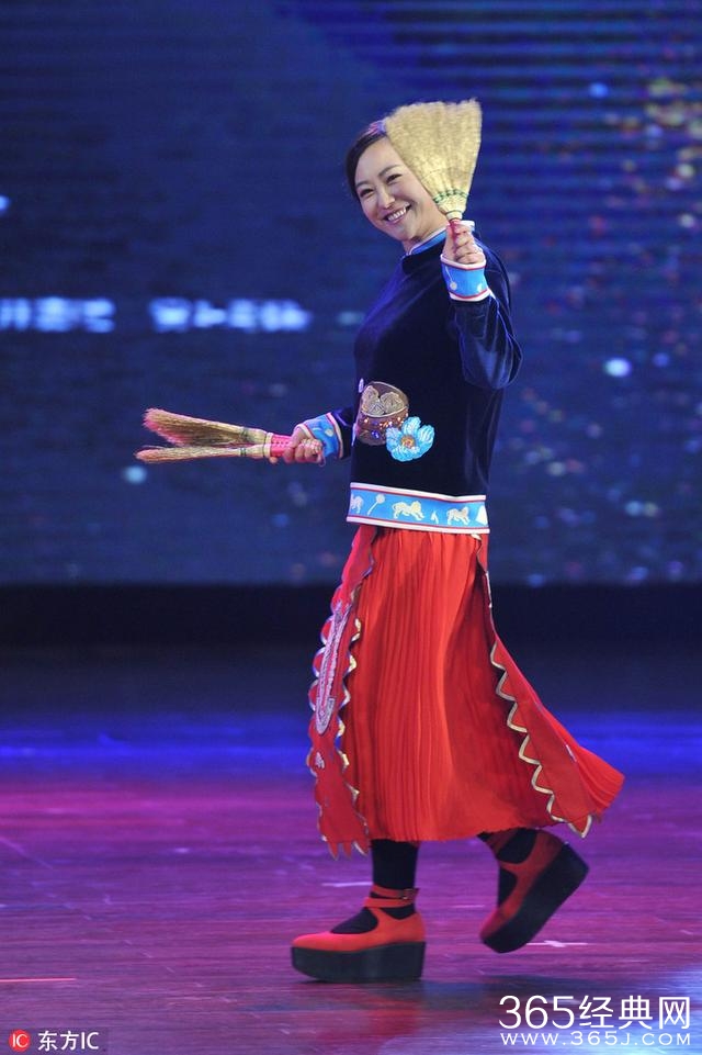 郝蕾拿着扫帚上台