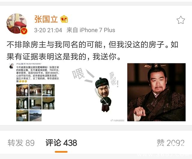张国立老师说话还是挺谨慎的,首先不排除房主的名字和自己重名,然后告诉你这不是他的,最后告诉大家谁能证明是他的就送给你,说的斩钉截铁。不留下任何悬念。嘚……,一个娱乐圈大新闻变成笑话了,既然是笑话了就有人凑热闹了。