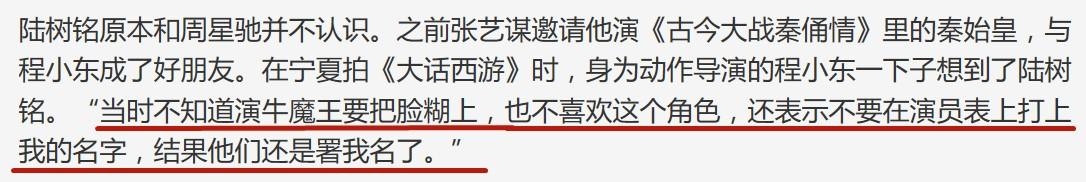 据说,当年《大话西游》香港与西安电影制片厂合作,陆树铭事先并不知道,饰演牛魔王需要全身上下沾满真毛,他不喜欢这个角色,加上本就是来帮忙的便跟剧组说希望影片演员表里不要出现自己的名字。