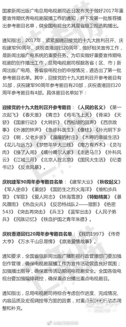 爱豆新闻讯 国家新闻出版广电总局电视剧司近日发布关于做好2017年重要宣传期优秀电视剧展播工作的通知,并下发第一批推荐播出参考剧目名单,供全国电视台尤其是省级卫视选购播出。