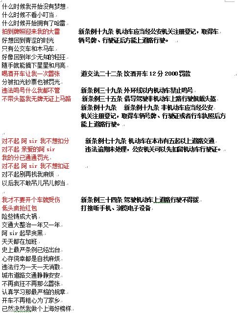 记者发现,歌词里藏着6条新版《上海市道路交通管理条例》(一下简称《新条例》)的内容,以歌词“拍到牌照迎来我的大雷”就与《新条例》的第十九条相对应,机动车应当经公安机关注册登记,取得车辆号牌、行驶证后方能上道路行驶;歌词“我才不要开个车就受伤,低头疯抢红包”就与《新条例》的三十四条对应,按照规定,驾驶机动车上道路行驶不得拨打接听手机、浏览电子设备。