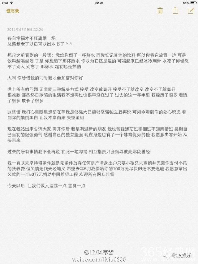 2014年,在微博上发表声明说离婚了。划重点:她说自己净身出户,孩子的抚养费也不需要前夫掏,还说前夫借了她100万,愿意拿出欠款的一半捐给慈善事业。