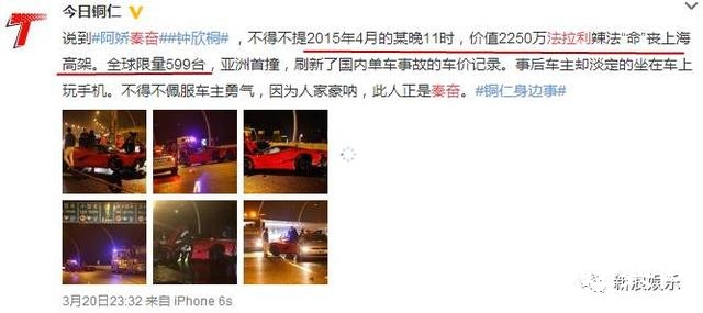 2015年的四月份,秦奋的法拉利撞在上海高架,全球限量599台价值2250万的法拉利就这么毁了……