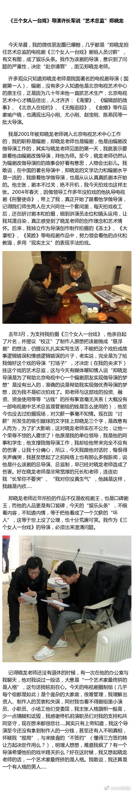 欠薪跑路事件在网络上发酵后,导演许长军发表长微博,向挂名的艺术总监郑晓龙“请罪”。许长军表示,自己曾拜郑晓龙为师学习导演,去年3月,为支持他拍摄《三个女人一台戏》,郑晓龙亲自起了片名,并在他的“央求下”才决定挂名艺术总监。并表示郑晓龙与这部戏的投资、融资、资金使用等等“沾钱”的所有事宜毫无关系。