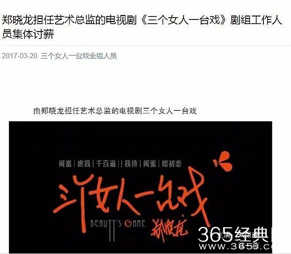 3月20日,“三个女人一台戏全组人员”微信公众号发布了一篇文章《郑晓龙新剧〈三个女人一台戏〉剧组人员讨薪》,文章爆料由郑晓龙担任艺术总监,刘恺威、江一燕主演的新戏《三个女人一台戏》因拖欠薪资导致剧组停机,该剧制片人、财务等跑路,拖欠剧组工资等各类费用约900万,把剧组380人“丢”在了陇西。