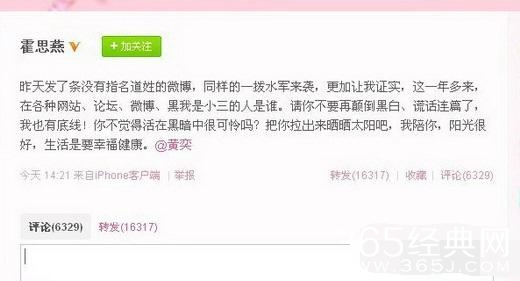 2011年10月,霍思燕在微博大骂某女星“贪慕虚荣、撒谎愚蠢”,“只要一有新戏就会把她那肥头大耳的前夫扣在我的头上”。正在大家在猜霍思燕骂的对象是谁时,次日,霍思燕直接点名@黄奕,发了下面这条微博: