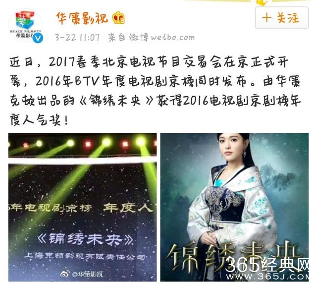 爱豆新闻讯 近日,2017春季北京电视节目交易会在京正式开幕,2016年BTV年度电视剧京榜同时发布,由华策克顿出品的《锦绣未央》获得2016电视剧京剧榜年度人气奖!