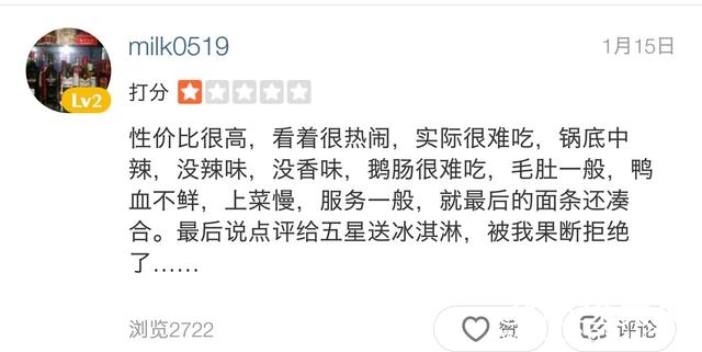 之前在点评网上,就有顾客给出了差评:“鹅肠很难吃,毛肚一般,鸭血不鲜”。