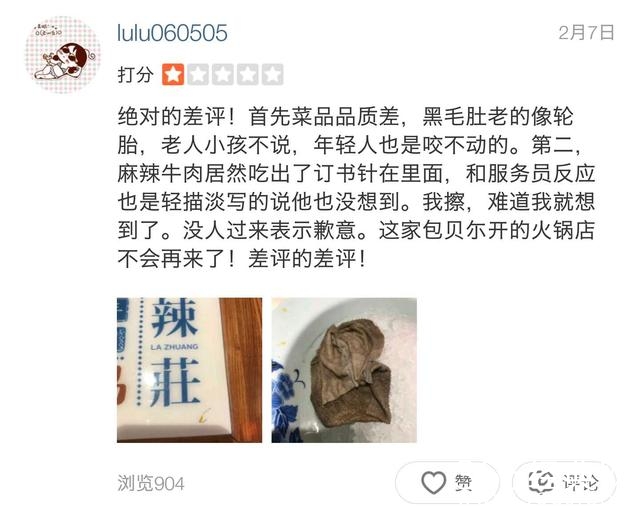 还有顾客说,“黑毛肚老的像轮胎”,“麻辣牛肉居然吃出了订书钉在里面”。这样的饭店,怎么放心让人去吃饭?