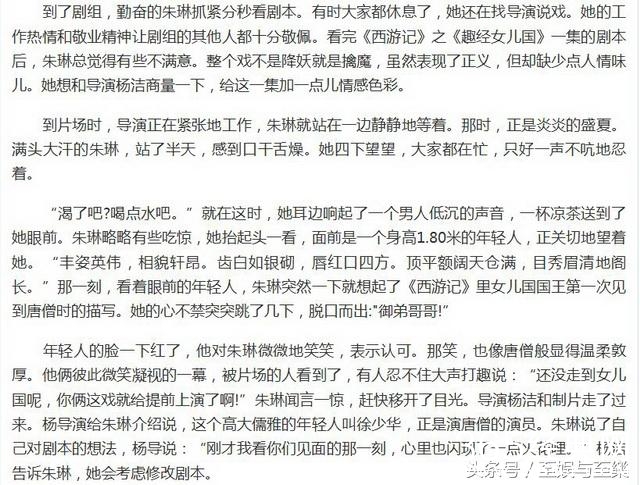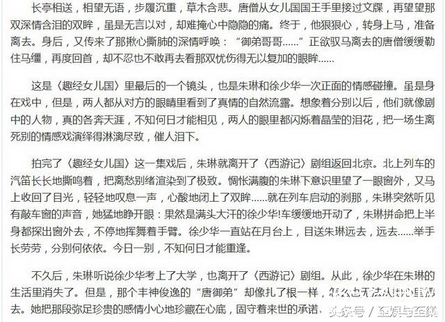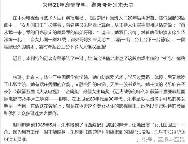 在1985年朱琳主演了电视剧《西游记》中女儿国国王,那柔情似水的女国王,成了观众心中永远的经典、朱琳也正是因为这个角色,爱上了温文尔雅的御弟哥哥,才有了这段旷世不遇的未了情。先来看看那篇具有传奇色彩的文章,据说是某个杂志独家采访朱琳,然后批露了朱琳和徐少华这一段未了情。这篇文章的标题是“朱琳21年痴情守望,御弟哥哥别来无恙”。由于文章太长,所以用截图方式展现给大家。