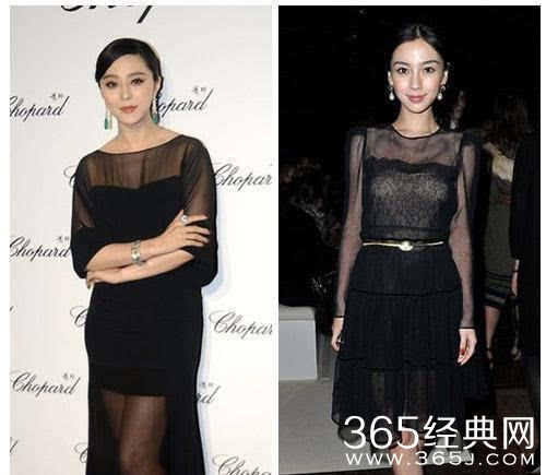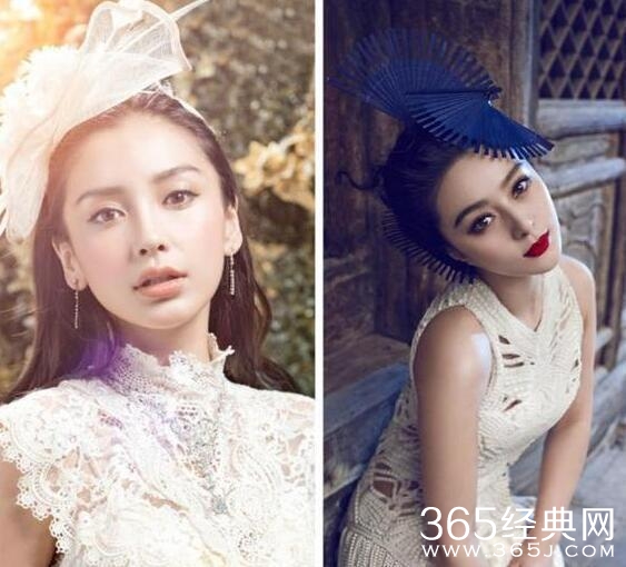 这张虽然两人没有撞衫,却撞了头饰,baby头上斜戴着的帽帽配上蕾丝裙,美得不可方物,似乎就是真正的公主。范冰冰的扇子头饰斜着戴与baby气质完全不一样,那眼神,那身姿,十足一股妖媚劲儿。