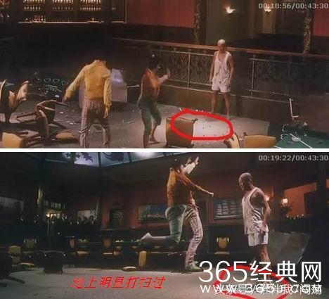 电影《功夫》穿帮二:工作人员太勤快 肥婆把桌子踢翻后桌子的碎片和牌等东西都应该洒落一地, 但后几个镜头地上却干净空无一物?